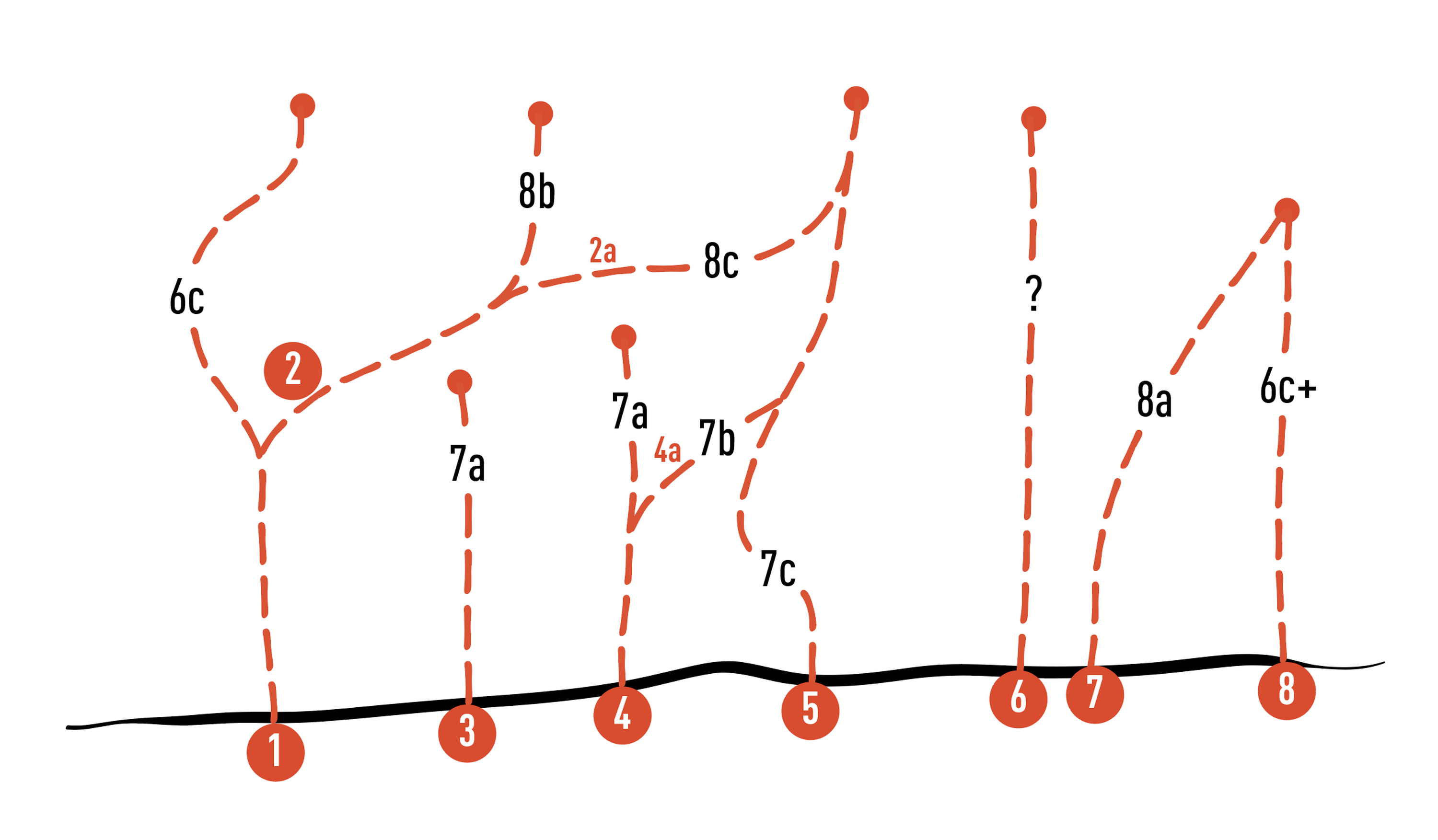 Chi sta leggendo ora queste righe, dovrebbe aver già idea di chi sia Andrea e di cosa abbia fatto: Hyaena e Ombra sono masterpieces ben noti, annata 1986 l’una e 1988 l’altra. Chi tenta queste vie, non prova degli 8b+ qualsiasi, ma tiri che hanno una loro personalità, caparbia e decisa, specchio del loro ideatore. Ma Andrea firmò in quegli anni la libera di tanti altri rompicapo e spaccadita finalesi: Bananna Stranna (1984, “solo” 7c+...), Radical Chic (1985, il primo 8a finalese), Jamin-a (1987, 8a+), Poi Capace (1988, 8a+), Hueca Solo (1989, 8b, ad oggi irripetuta...).