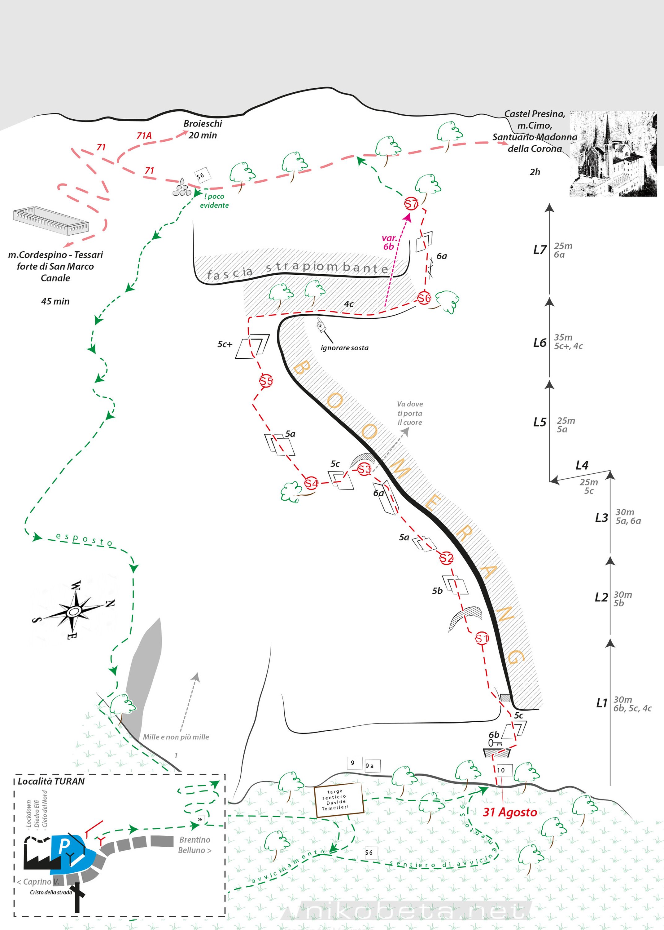 La rossa parete Castel Presina sembra estremamente friabile ed infatti la prima via (Baby Doc, consigliatissima!) venne aperta da Sergio Coltri e Matteo Vianini solo nel 1993. La parete si presta ad un’arrampicata invernale in quanto è sempre gradevolmente calda.