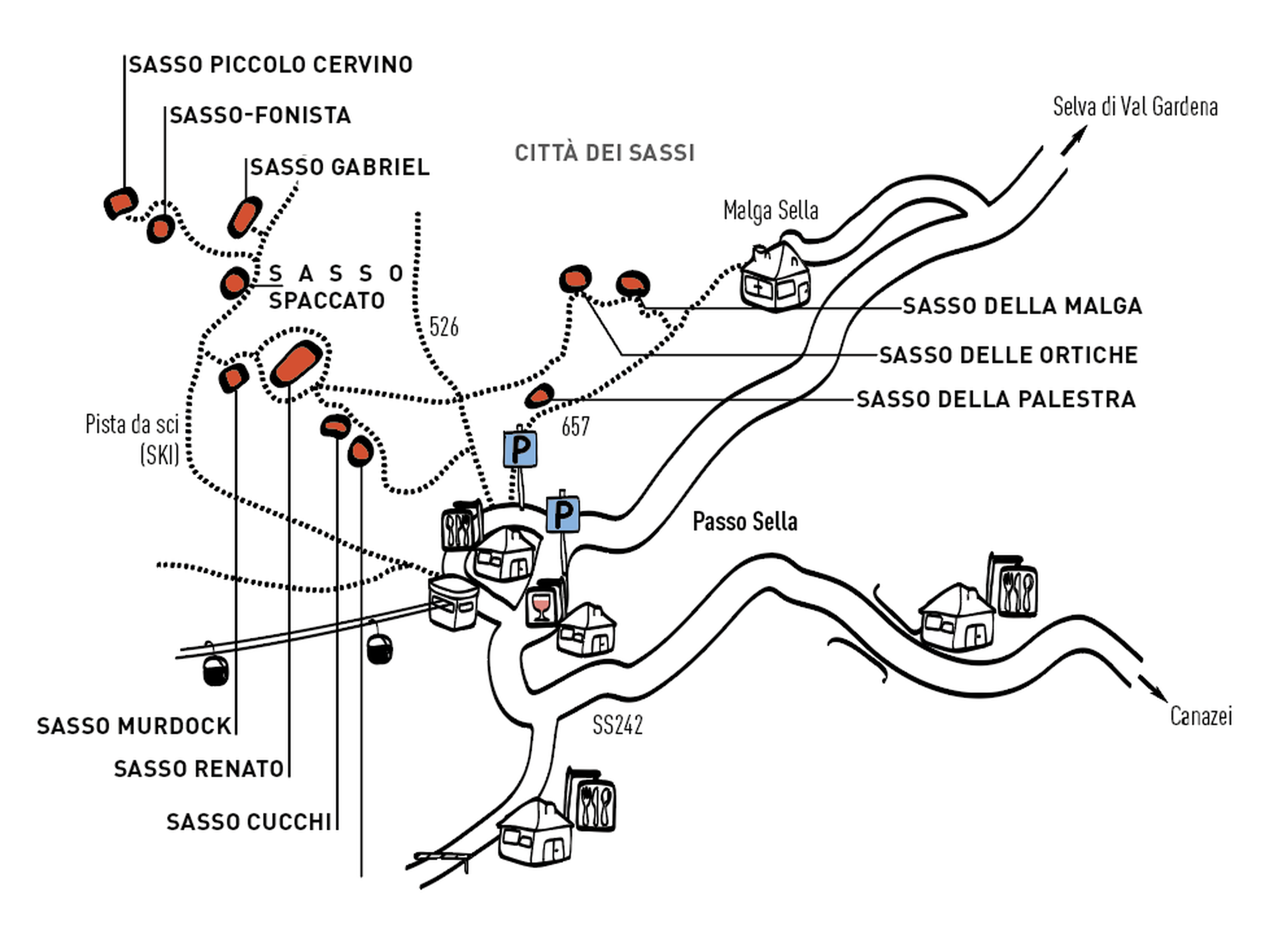 Il gruppo del Sella è il secondo più grande per estensione di tutte quante le Dolomiti dopo le Pale di San Martino. Per questo motivo “girarci intorno” alla ricerca di falesie richiede un po’ di tempo ma ne vale veramente la pena. Conosciuto essenzialmente per l’incredibile offerta di vie alpinistiche trad. e moderne, per gli amanti dell’arrampicata sportiva o per alternare, non mancano diverse falesie, alcune delle quali tra le più conosciute e frequentate di tutte le Dolomiti (ad esempio “Città dei Sassi” a Passo Sella o
