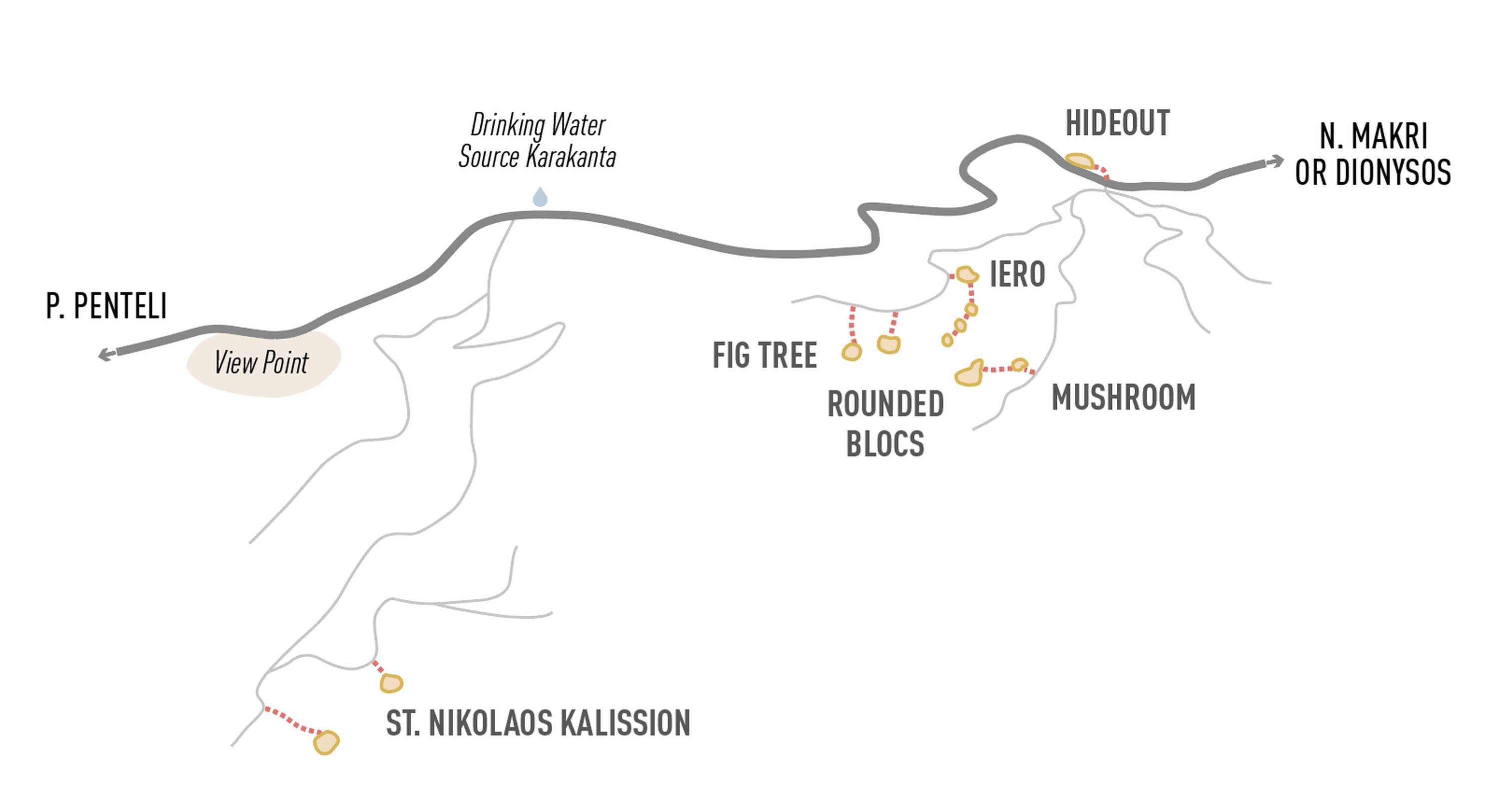 I primi problemi di bouldering appositamente sviluppati nell’Attica, tuttavia, apparvero intorno al 2002 sul Monte Penteli, vicino al monastero di San Panteleimon, ad opera di Eva Moschovits e Dimitris Titopoulos. Negli anni successivi, un numero crescente di climber si interessò alla scoperta e alla salita di problemi sui massi in conformità con l’etica del più ampio mondo dell’arrampicata, fortemente influenzato da Fontainebleau, Hueco Tanks e altre scene europee del b…